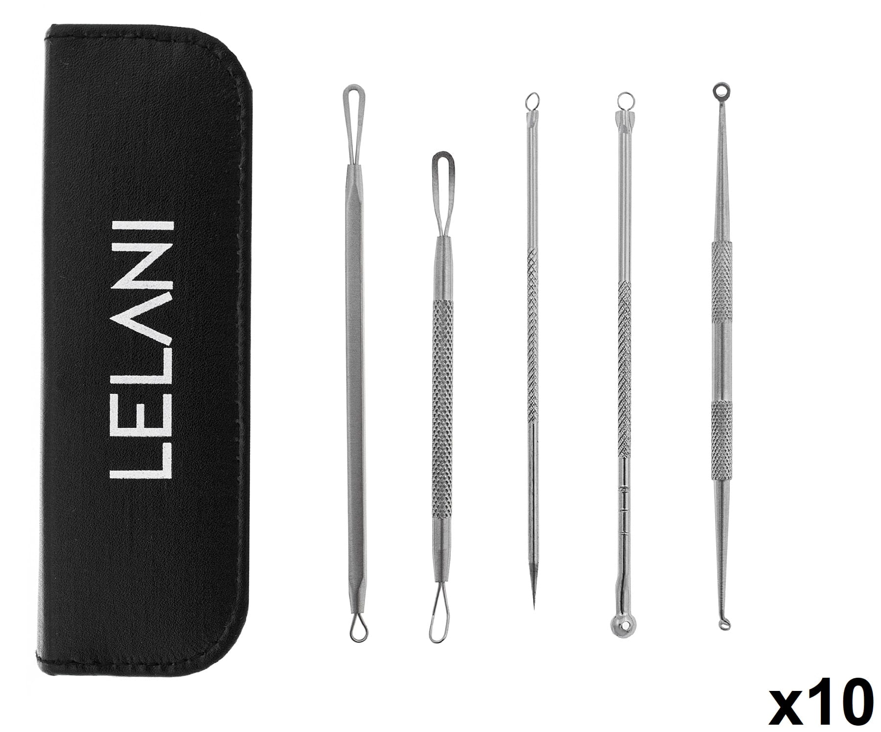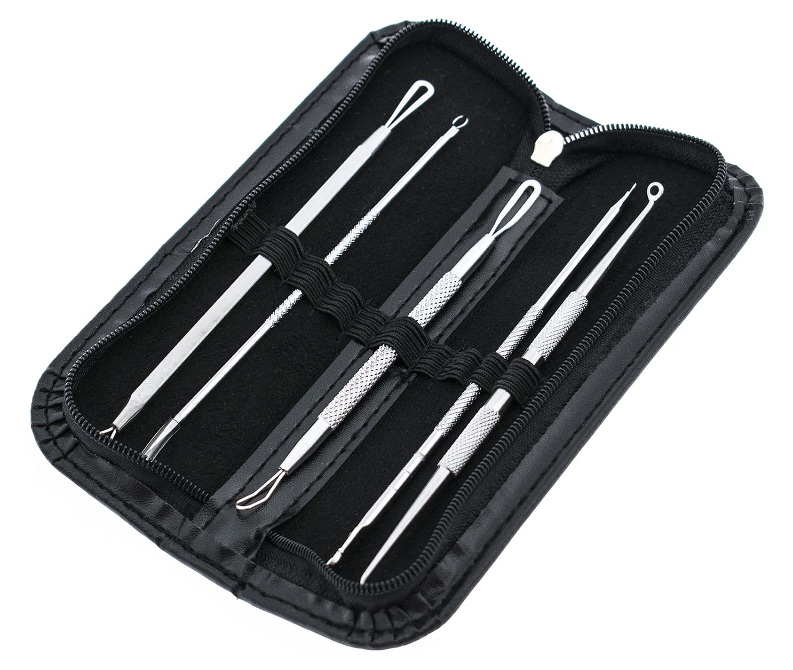 Profesjonalny zestaw 5 dwustronnych łyżeczek Unny, w których większe końcówki pomagają wyciągać pryszcze z białymi końcówkami, mniejszymi zaś usuniesz zaskórniki!