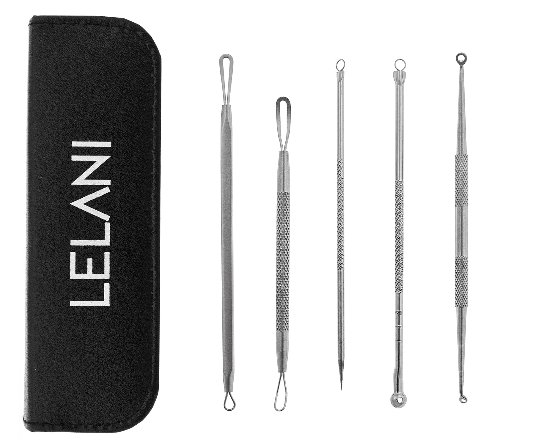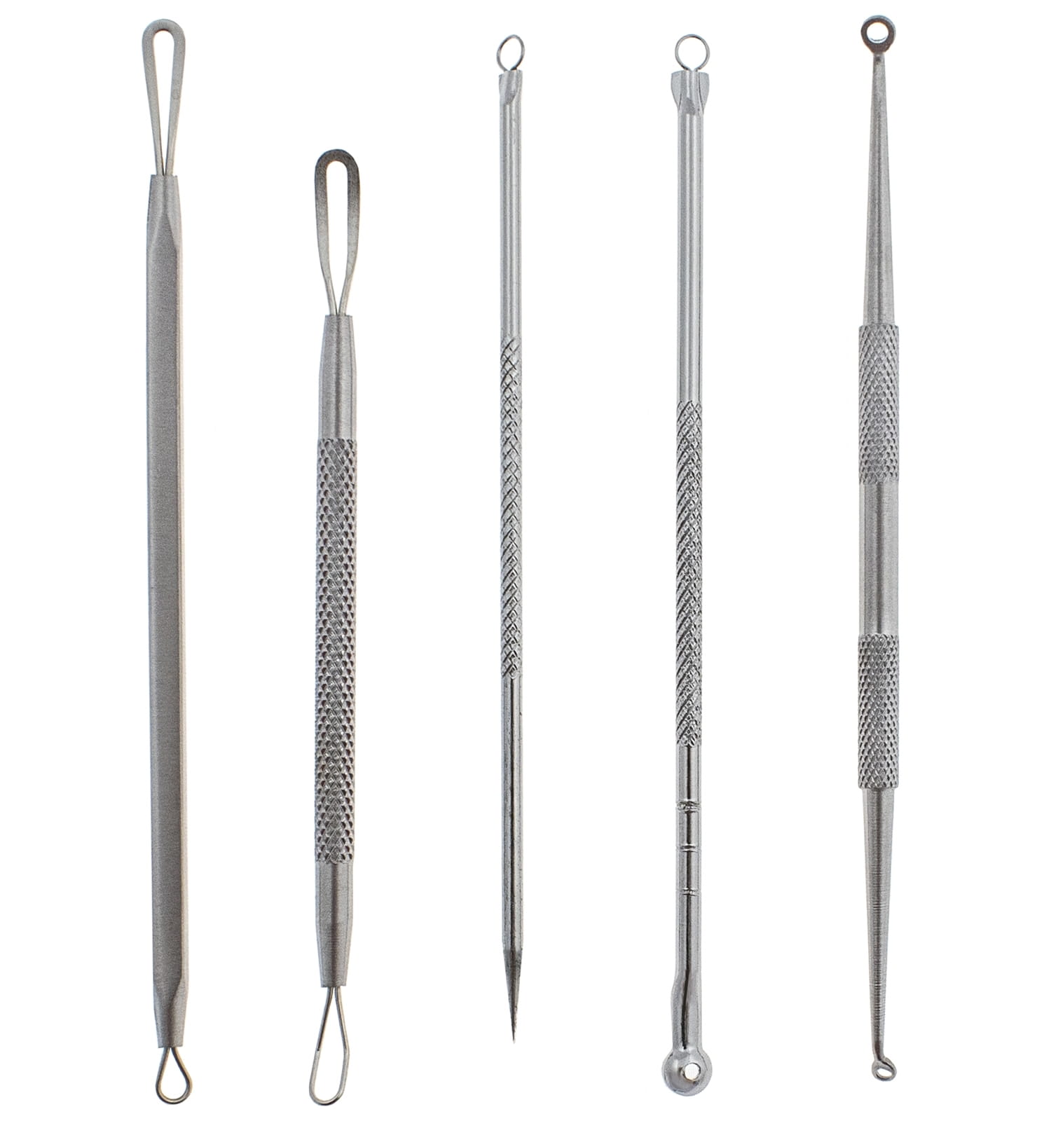 Profesjonalny zestaw 5 dwustronnych łyżeczek Unny, w których większe końcówki pomagają wyciągać pryszcze z białymi końcówkami, mniejszymi zaś usuniesz zaskórniki!